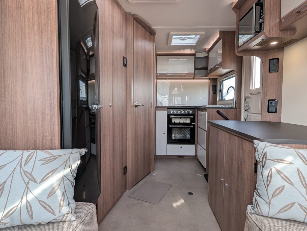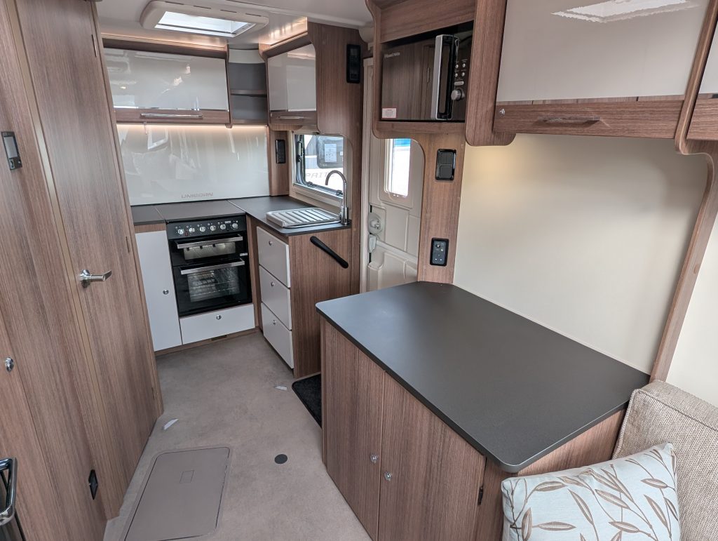 The End Kitchen: Positioned at the rear, this dedicated workspace features extensive worktop areas, a Thetford Caprice combined oven/grill/hob, and an integrated microwave. This layout is perfect for those who enjoy cooking without encroaching on the living area.