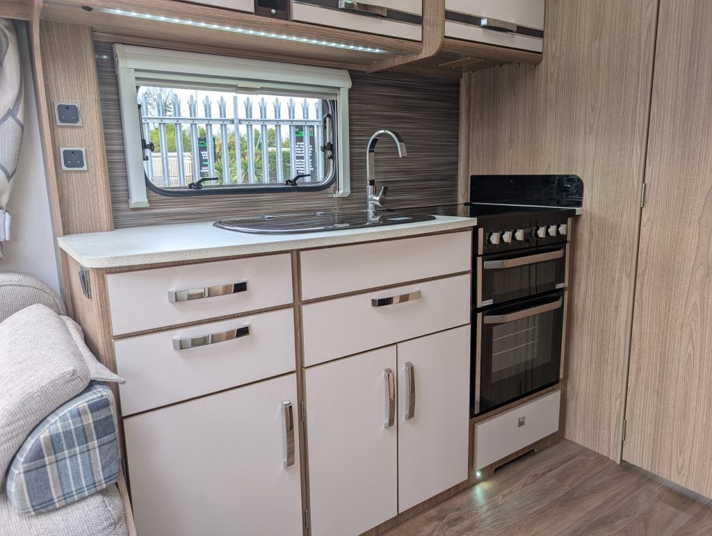 Gourmet Kitchen: Equipped with a full oven, grill, 800W microwave, and the large Dometic fridge/freezer.