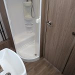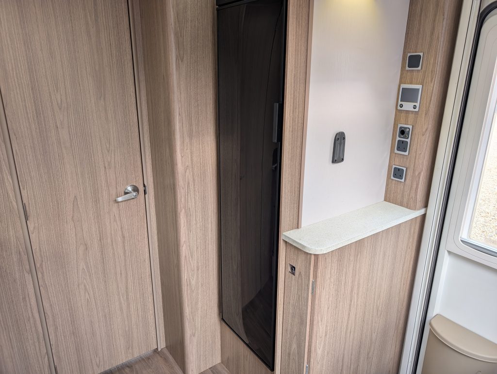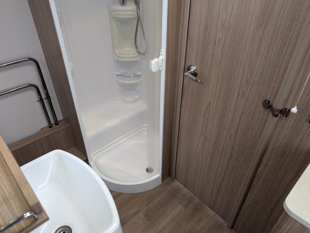 Central Washroom: A clever “pass-through” bathroom that spans the width of the caravan. It features a large independent shower cubicle on one side and a private vanity/toilet suite on the other. This area can be closed off from both the lounge and the bedroom.