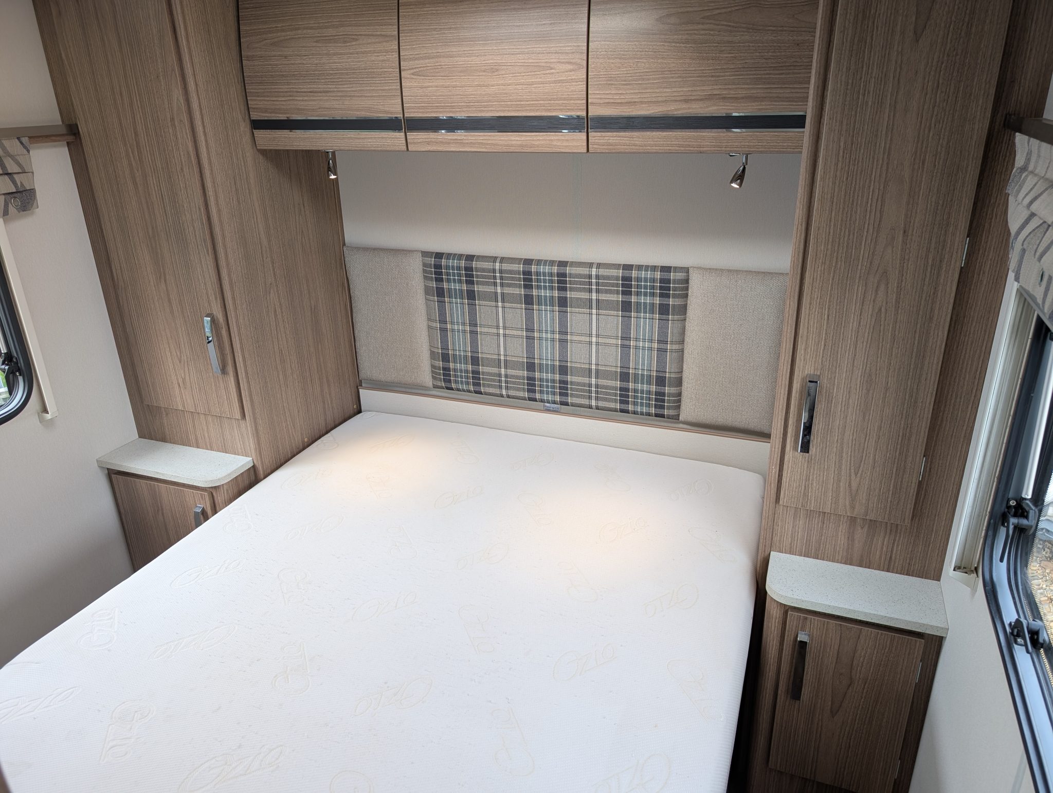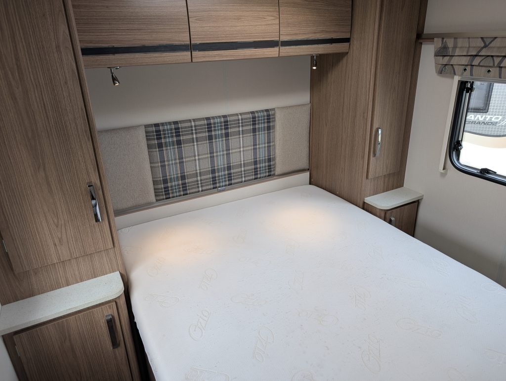 Rear Bedroom: A dedicated sanctuary featuring a fixed longitudinal island bed with dual wardrobes and bedside storage.