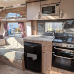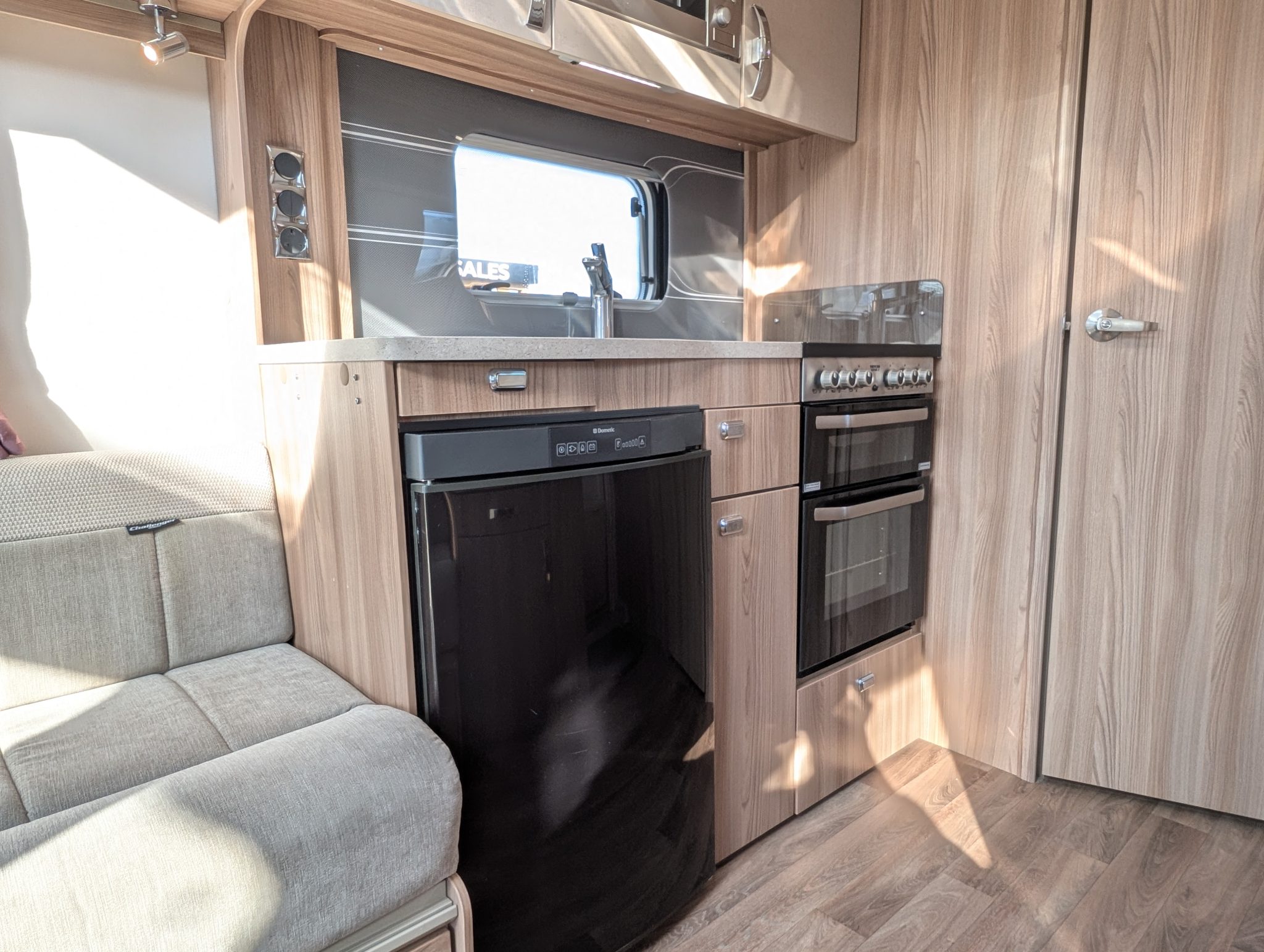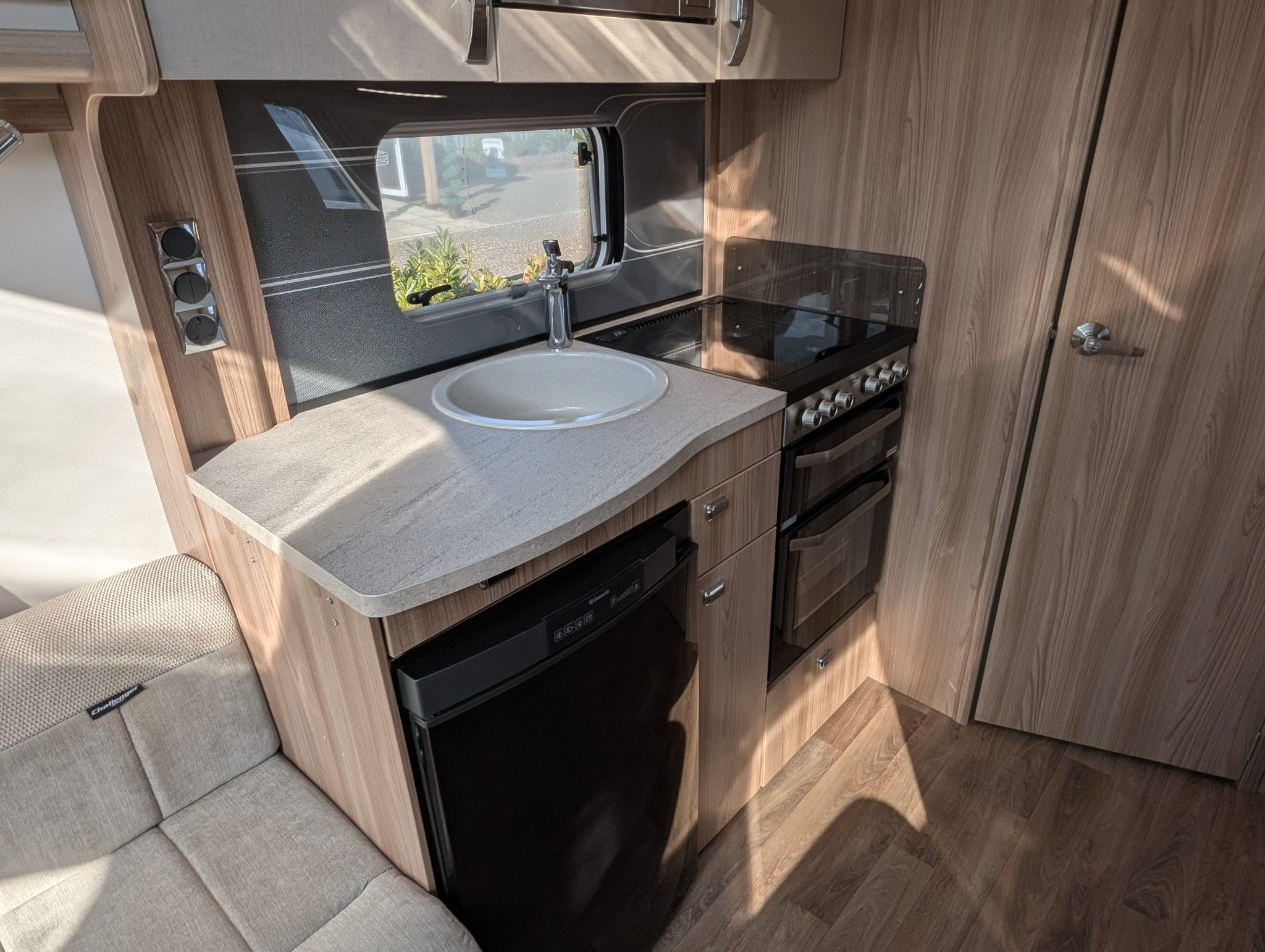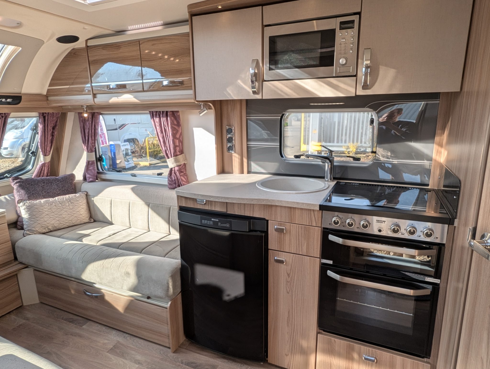Kitchen: Fully equipped with a tall Dometic fridge/freezer, microwave, ventilated oven, and dual-fuel hob (3 gas burners, 1 electric hotplate).