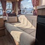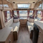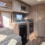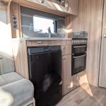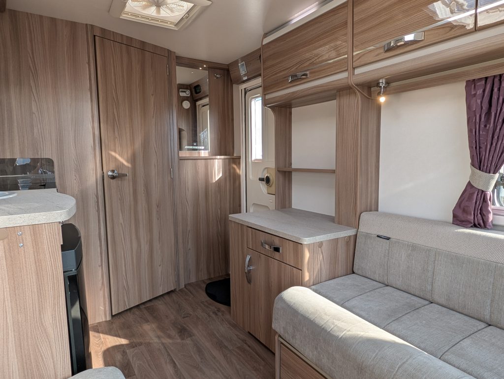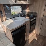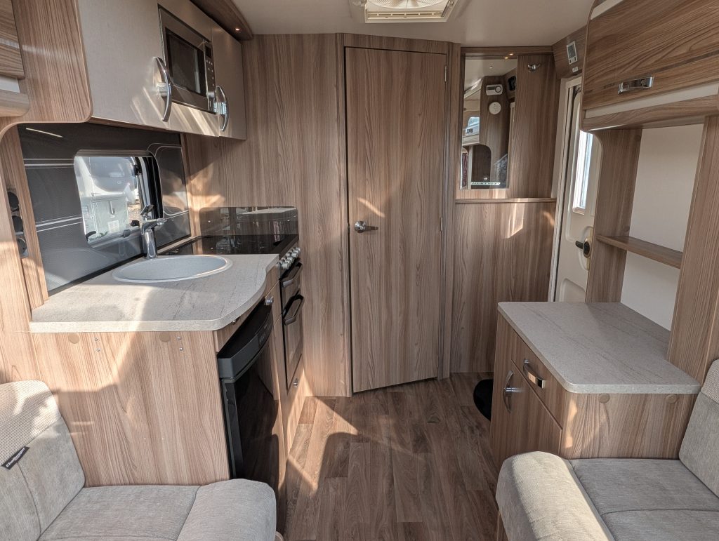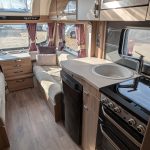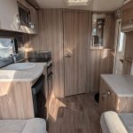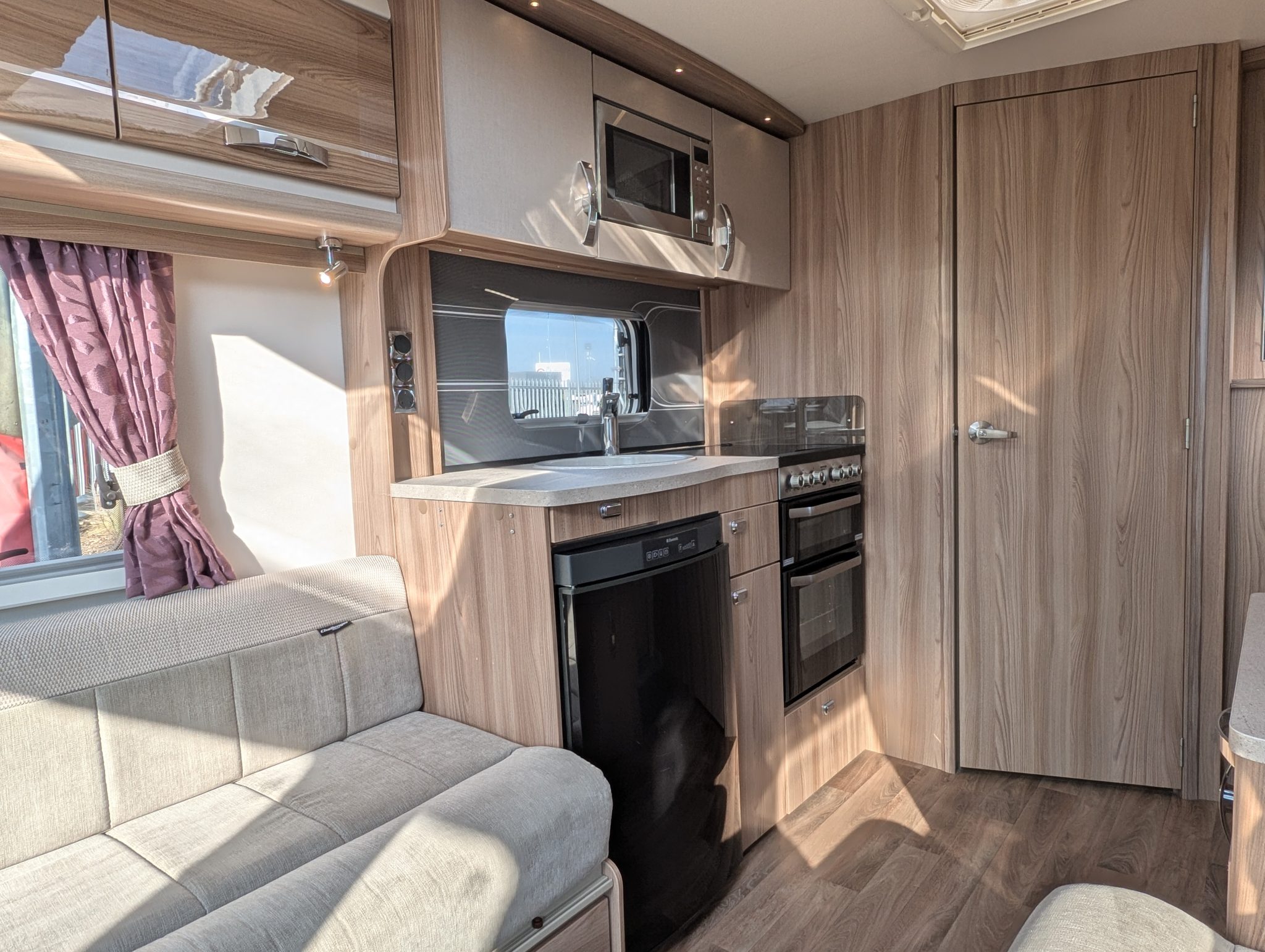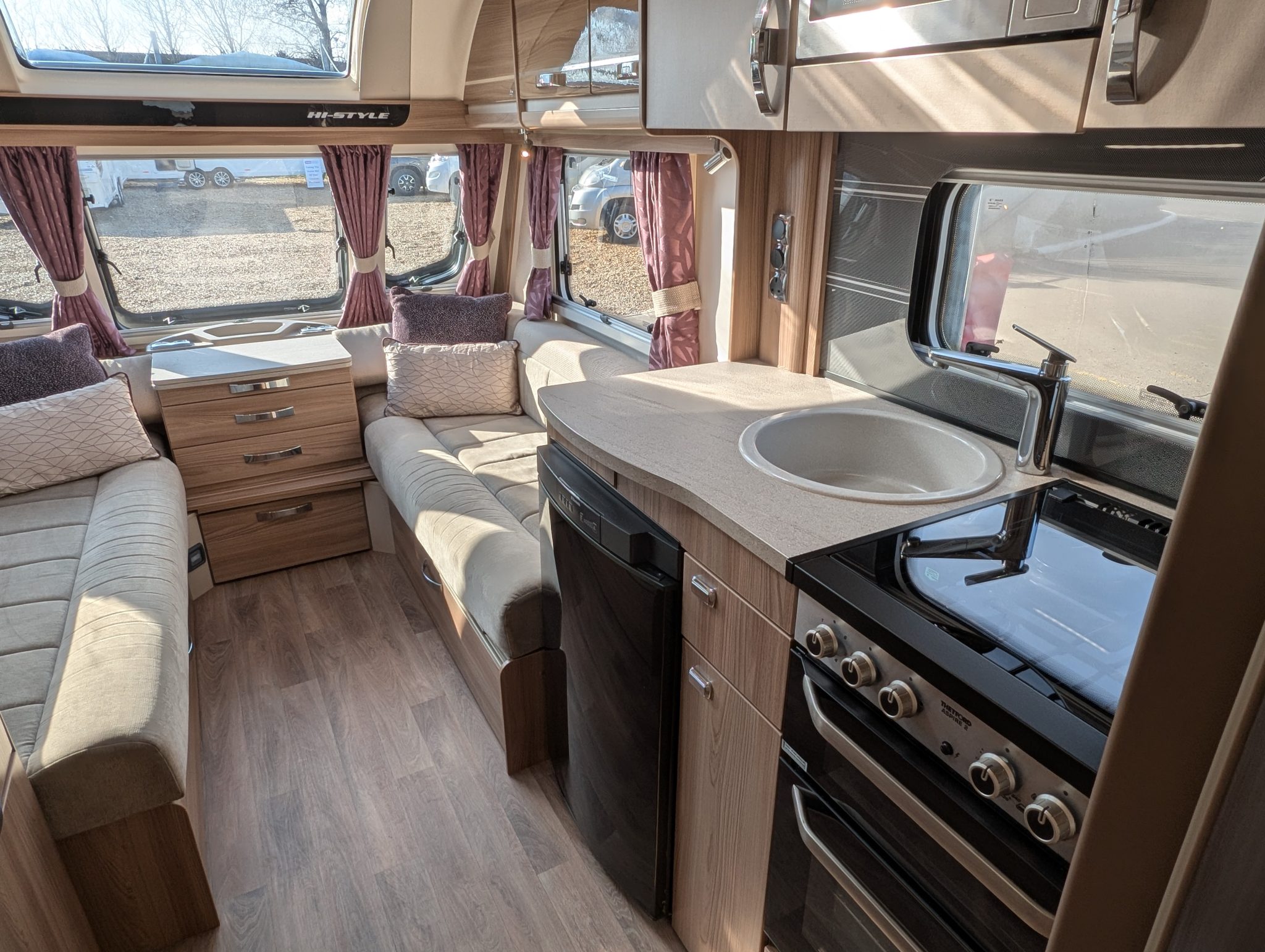Kitchen: Fully equipped with a tall Dometic fridge/freezer, microwave, ventilated oven, and dual-fuel hob (3 gas burners, 1 electric hotplate).